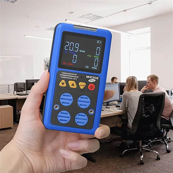 Газоанализатор МЕГЕОН 08180 – комбинированный ручной инструмент непрерывного действия, который применяется для одновременного анализа насыщенности кислорода и выявления наличия сероводорода, угарного и горючих газов в воздушном пространстве. Устройство состоит из пластикового корпуса, в который установлены детекторы обнаружения. Внутренний микропроцессор координирует процессы замеров и конвертирует импульсы сенсоров в данные на экране. Три вида сигнализирования: визуальный, звуковой и вибрационный. Два порога срабатывания тревожного сигнала.