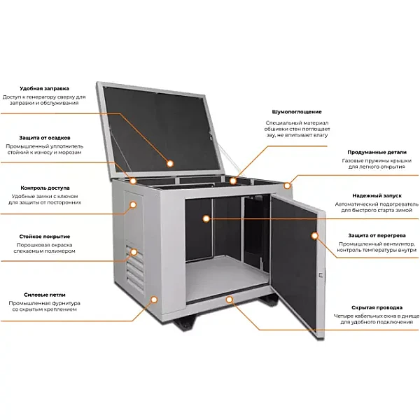 Кожух для генератора предоставляет легкий доступ к оборудованию со всех сторон, для этого предусмотрены два боковых люка и верхняя крышка, которая крепится петлями промышленного класса и удерживается в нужном положении газовыми амортизаторами. Обе дверцы и крышка защищены замками.