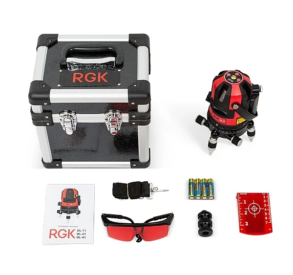 RGK UL-41 строит четыре вертикальных плоскости и горизонтальную с развёрткой 110°, благодаря чему устройство может охватить все стены помещения с одной позиции. Поворотный корпус UL-41 с двумя винтами наводки снабжен горизонтальным лимбом и позволяет аккуратно и точно перенести плоскость на нужную поверхность. Лазер UL-41 обеспечивает чёткую линию на любой поверхности на дистанции до 20 метров в помещении, а с использованием приемника лазерного излучения дистанция возрастает до 50 метров с возможностью использования прибора при ярком освещении. Точность построения линии составляет 0,2 мм на 1 м.