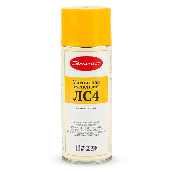Суспензия Элитест ЛС4 изготавливается на масляной основе, не вызывает коррозии и имеет слабый запах. Быстро реагирует на магнитное поле и долго сохраняет индикаторный след. Суспензия наносится на объект сразу после очистки его поверхности и намагничивания, не требуя создания фона. Единственный расходный материал, который нужен при работе с люминесцентной суспензией — очиститель (например, Элитест Р11). Контроль изделия можно проводить сразу после нанесения суспензии.
