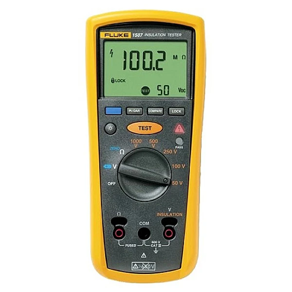 Fluke 1507 – универсальный мегаомметр. Прибор производит количественный анализ изоляционных свойств электрооборудования и кабельных материалов, измеряя сопротивление изоляции от 0,01 МОм до 10 ГОм. Измерения производятся при пяти фиксированных значениях тестового напряжения: 50 В, 100 В, 250 В, 500 В, 1000 В.