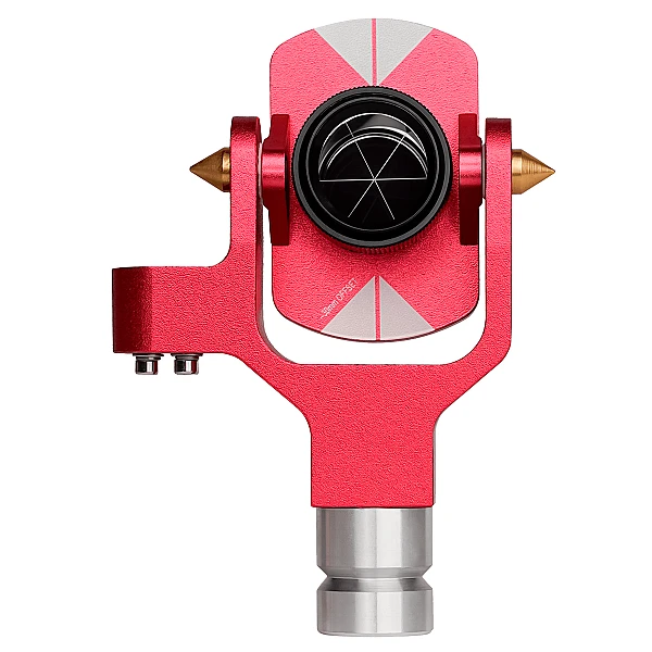 Фрезерованный U-образный держатель геодезического отражателя выполнен из анодированного алюминия и оборудован пузырьковым уровнем с поддержкой самостоятельной юстировки. Колба ватерпаса "утоплена" в металлической конструкции, что исключает ее случайное повреждение. Горизонтальная ось, обеспечивающая возможность произвольного наклона призмы, снабжена коническими выступами, что вместе с марками на креплении отражательного элемента упрощает наведение тахеометра на его центр.