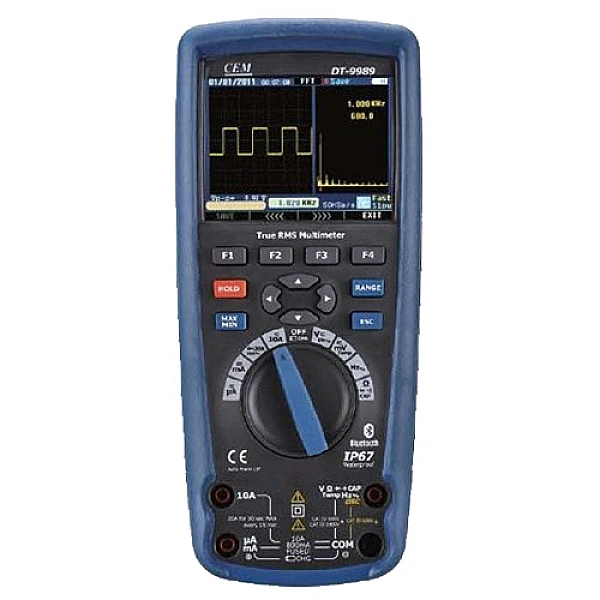 CEM DT-9989 – это цифровой портативный осциллограф, предназначенный для всесторонней диагностики и отладки промышленной электроники, определения работоспособности диодов, конденсаторов, обмоточных изделий типа дросселей, трансформаторов, электродвигателей, а также измерения параметров переменного и постоянного тока. При помощи CEM DT-9989 могут быть измерены как моментальные, так и среднеквадратичные значения напряжения, тока и частоты, а также выполнена прозвонка цепей. Посредством выносного термозонда типа К может измеряться и температура.