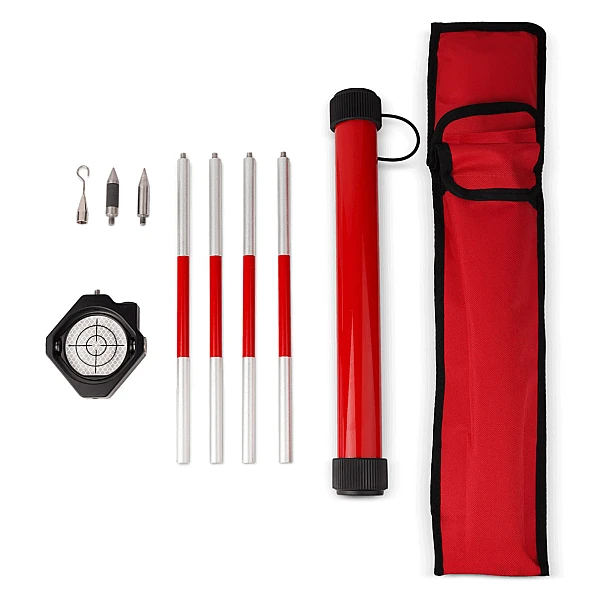 Минипризма RGK HDMINI 125, предназначенная для повышения точности тахеометрических измерений, представляет собой отражательную пластину пленочного типа с нулевым смещением на круглом основании, которое может наклоняться в вертикальной плоскости. На рамке держателя размещен пузырьковый уровень для выравнивания инструмента. В базовую комплектацию геодезического отражателя включена сборная 4-секционная веха с четвертьдюймовыми соединителями и два наконечника с подвесом, которая позволяет устанавливать отражательный элемент на разной высоте – в зависимости от измерительных задач. Элементы вехи при неиспользовании помещаются в жестком тубусе для минимизации риска случайного повреждения.