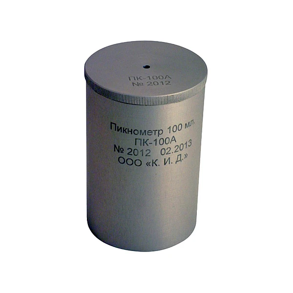 Алюминиевый пикнометр емкостью 100 мл. представляет собой стакан с притертой крышкой, на которой имеется отверстие для выпуска излишков испытуемого материала. Пикнометр изготавливается из твердого алюминиевого сплава с низким коэффициентом температурного расширения.