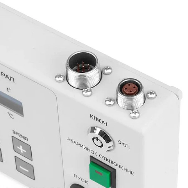 Пульт управления оснащен замком безопасности, что исключает возможность несанкционированного запуска рентгеновского излучения. В верхней части пульта находятся разъемы для подключения к блоку питания и блоку сигнализации. На дисплей пульта управления выводится вся необходимая для оператора информация: напряжение на трубке (U, кВ), анодный ток (I, мА), время экспозиции (T, сек.), температура изолирующего масла (t, °C).