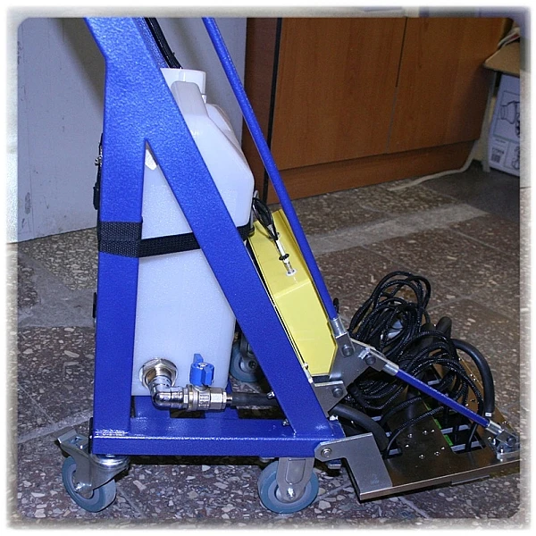 Перемещение тележки осуществляется на колесах. Для легкого подъема и опускания акустического блока на механической части установлен  рычаг