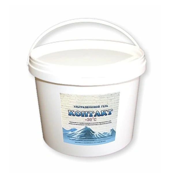 Гель «КОНТАКТ» в ведре массой 2,2кг, объёмом 2200мл – применяется в дефектоскопии в качестве акустического слоя между ультразвуковым преобразователем и объектом контроля. Не требует специальных средств для удаления с поверхности. Легко удаляется с поверхности водой или сухой ветошью.
